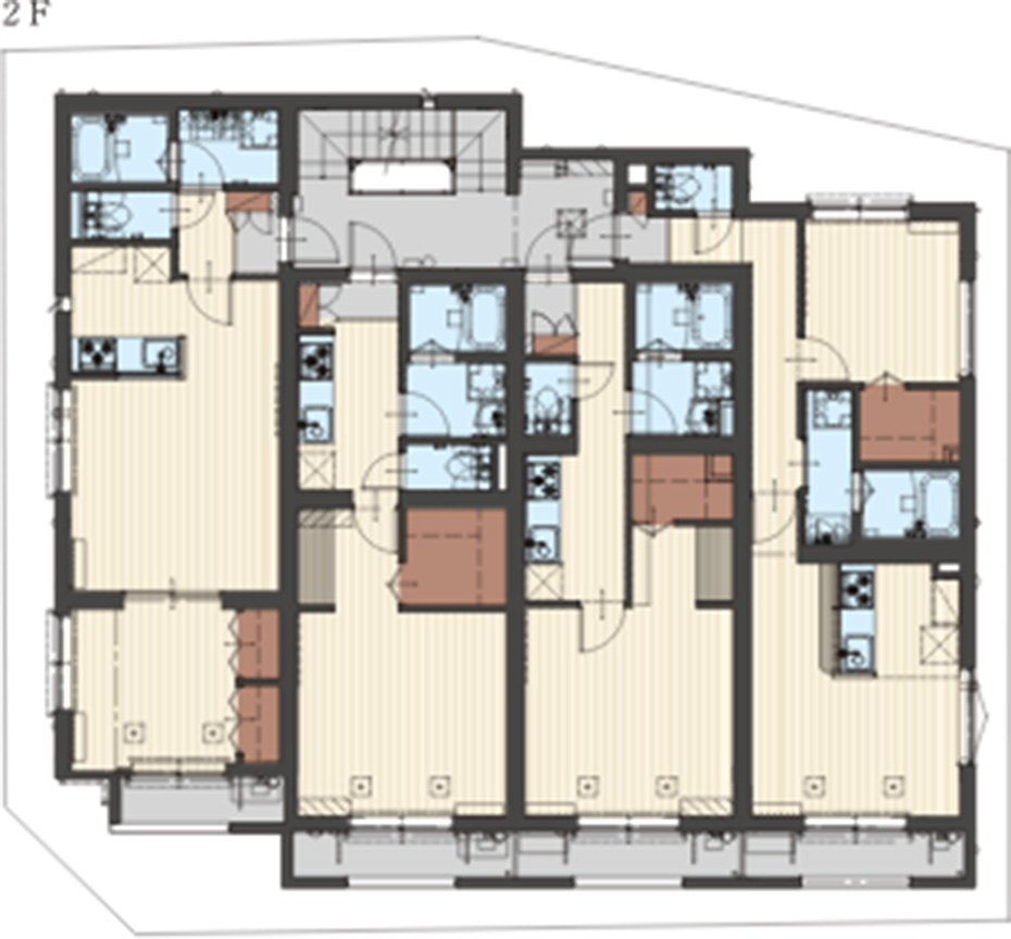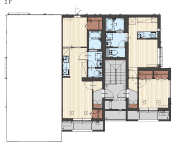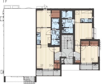 オーナー様宅は、1階と2階を縦に使用することで、入居者との上下階の音の不安を解消。さらにオートロックの玄関を賃貸スペースの中心に配置することで隣同士の音の問題にも配慮しています。
