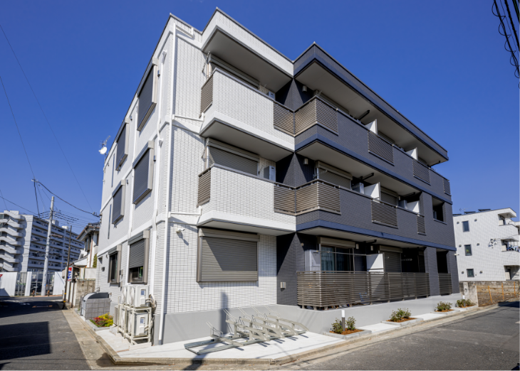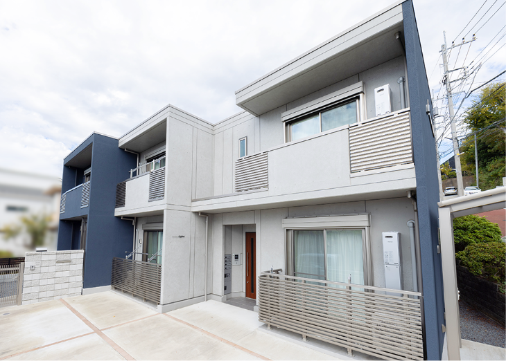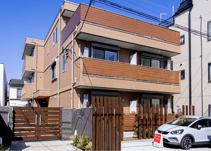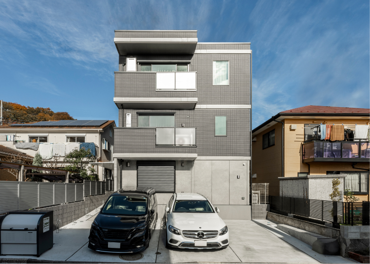 道路からみて一番奥にオーナー様宅、手前に賃貸スペースとすることで、オーナー様の生活動線に入居者が干渉しないようにプライバシーを確保。オーナー様宅の3階には太陽光発電システムを採用し、余った電気を売電しています。